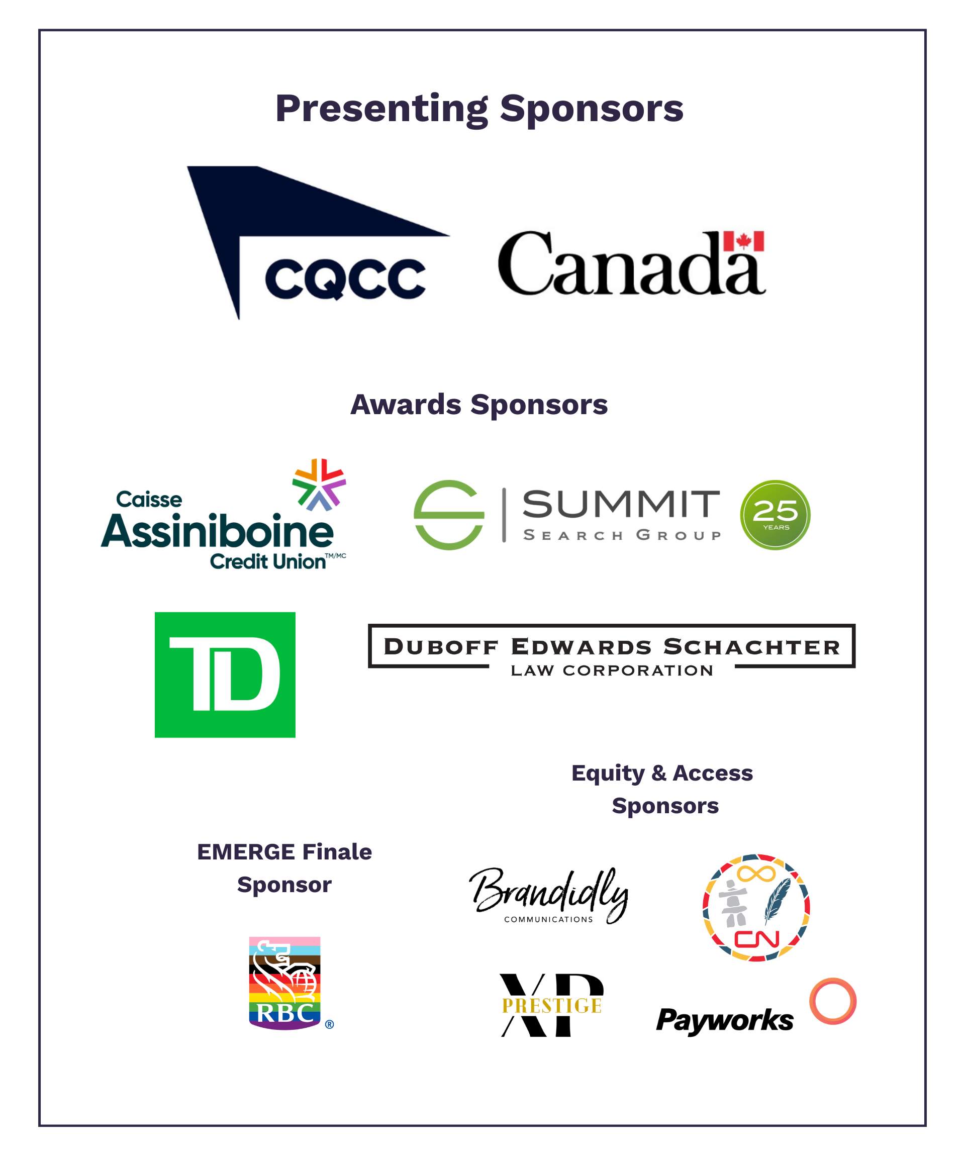 Equity & Access Sponsors – Brandidly, CN Indigenous Relations, Payworks, Prestige XP